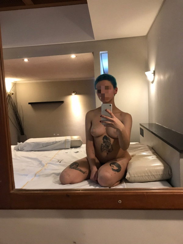 soy una chica flaca, bajita (1.60 aprox), pelo corto azul, tatuajes, piercings, sin depilar.